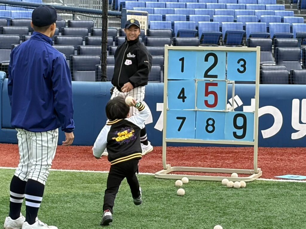 令和7 年 11 月 29日 (土)、「第6回野球であそぼう」が初めて横浜スタジアムで開催されました。 神奈川県内を中心に開場前から多くの方々が来場し、子どもたちとその保護者計約 900 名に野球を楽しんで頂きました。 今回は、横浜隼人高校、湘南学院高校、三浦学苑高校、東海大相模高校、舞岡高校、鶴嶺高校、大磯高校の選手及びマネージャー約 100名が指導役を務めました。 横浜スタジアムのグラウンド内では、キャッチボール、ノック体験、ストラックアウト、スピードガン、ティーバッティング、塁間ダッシュ、キッズスペースに分かれ、高校生の指導を受けながら体験を行いました。 高校生たちの丁寧な指導や見本の披露もあり、参加した子どもたちは終始楽しそうに身体を動かしながら選手、マネージャーとの交流を楽しみました。